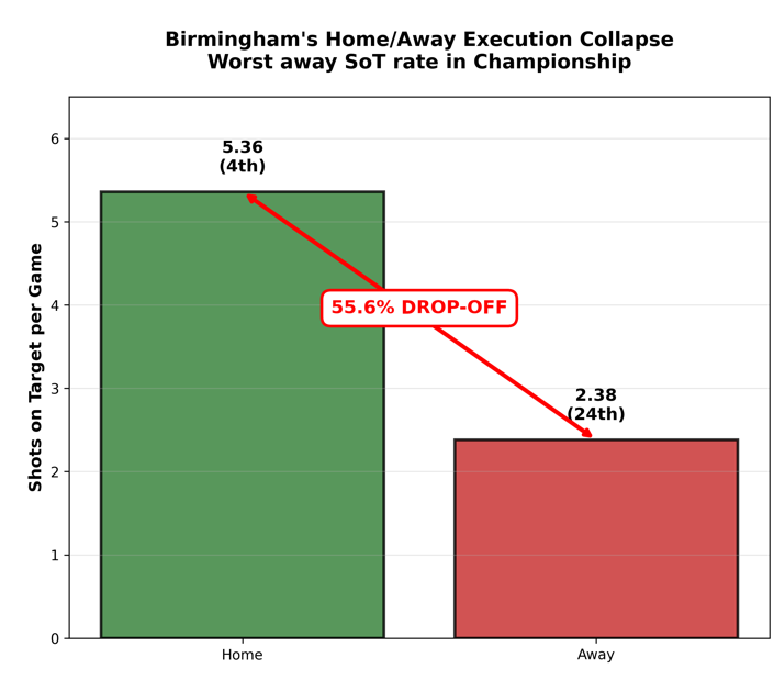 If typical home advantage in professional football provides a 10-30% boost to performance, Birmingham’s 55.6% variance is well beyond what home advantage alone explains. The same players who generate elite shot output at St. Andrew’s (4th-best in the division) produce the worst away record for getting efforts on target.