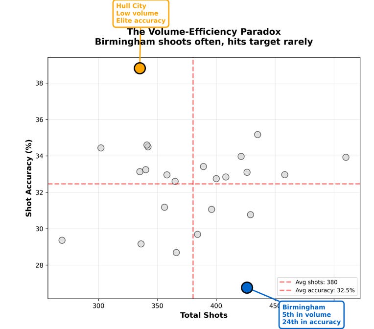 Championship data validates the core findings: Hull City are 19 positions above their expected points position by optimizing shot accuracy. Blues are 10 positions below their expected points position despite consistently winning match-by-match xG battles.